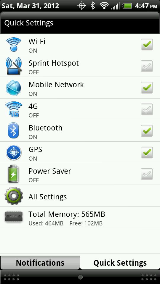 Swiping down to access Notifications also gives you a list of recently used app icons displayed along the top (tap on one to jump straight to it), as well as a Quick Settings tab for frequently used options such as Wi-Fi, Sprint Hotspot, 4G and GPS.