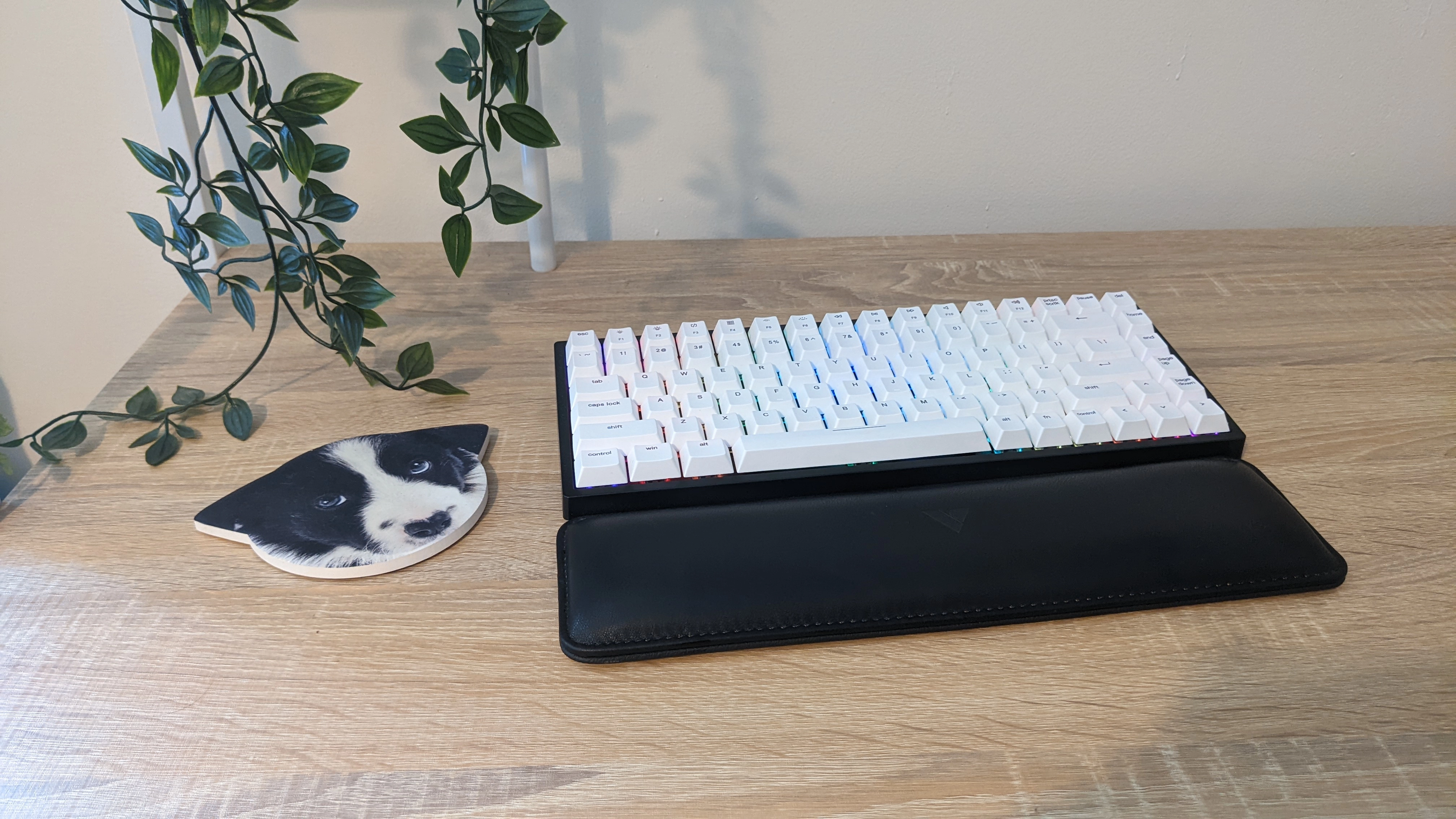 The Vissles V84 connects via either a USB cable (the supplied cable is for a USB-A port) or a Bluetooth connection. Strangely, there are two unused USB port outlines on the back of the casing, presumably a holdover from an older model. Vissles also includes a squashy leatherette wrist rest, which is a very nice addition.