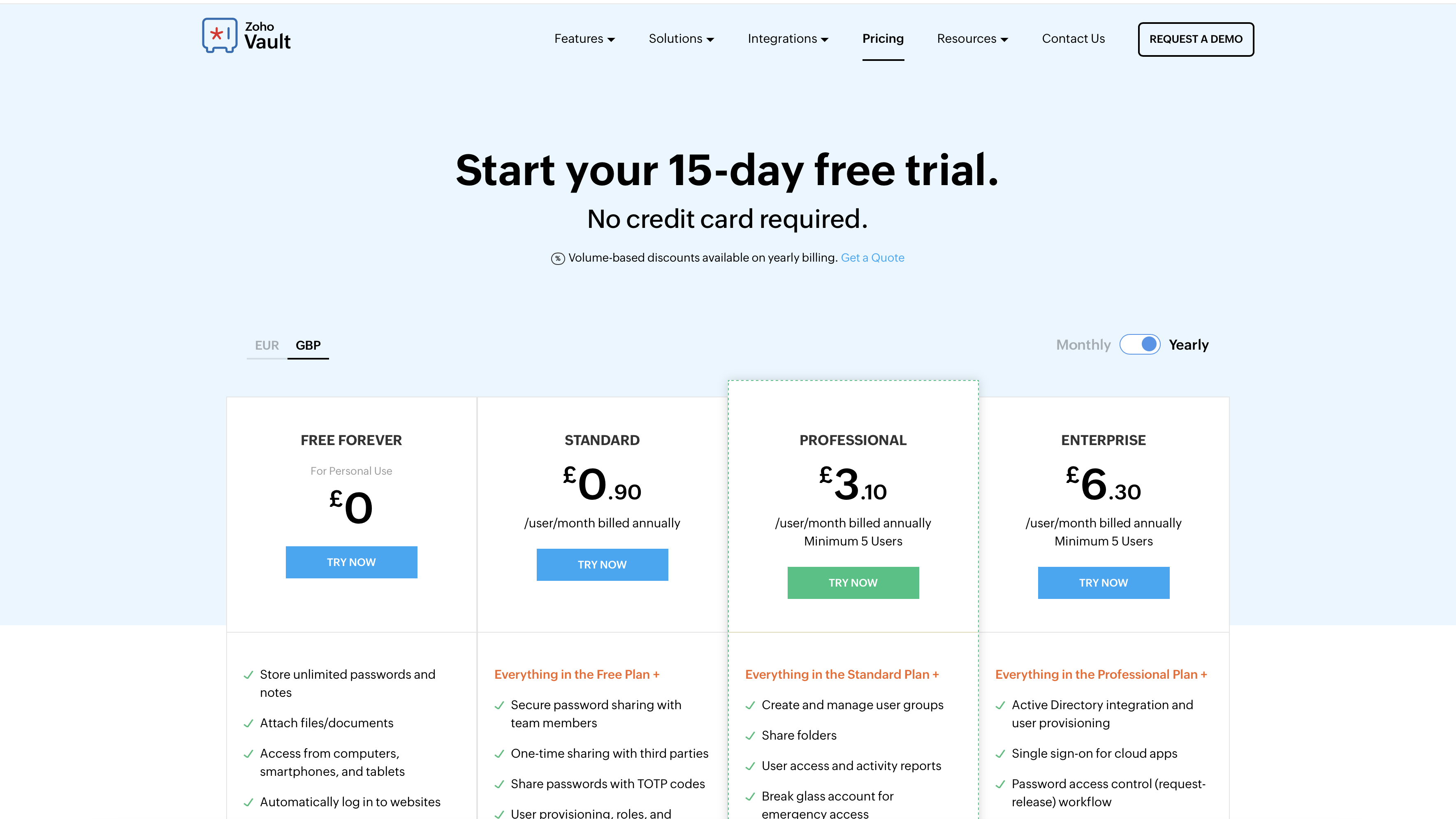 Zoho Vault has four pricing plans, including a free tier and free 15-day trial of all the paid plans where you do not need to enter your card details. Zoho Vault Free is the only plan for personal use, with unlimited password storage and two-factor authentication (2FA). It can also generate strong passwords, supports mobile platforms, has browser extensions for major browsers, and integrates with the other Zoho apps.