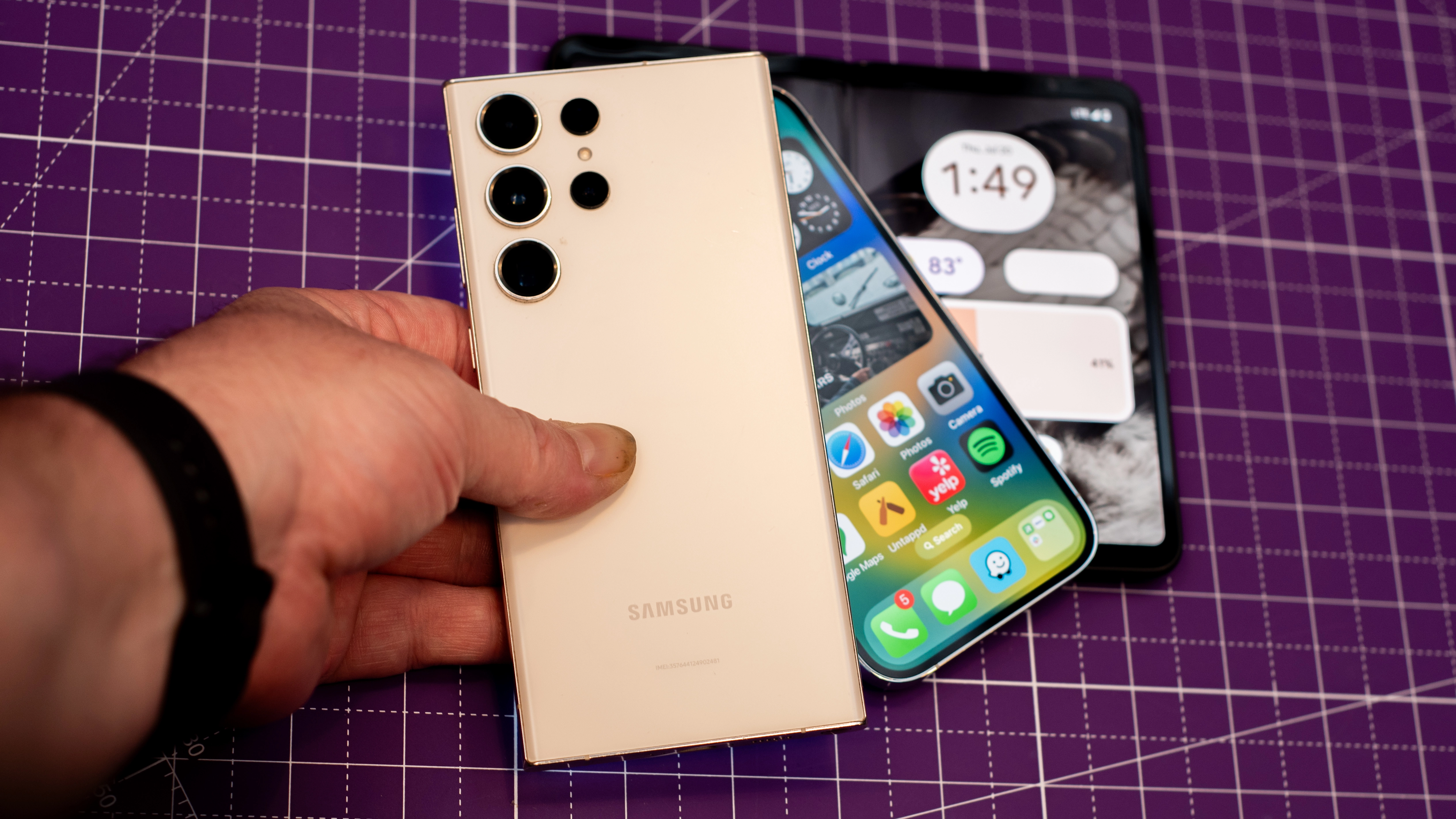 Samsung Galaxy S23 Ultra on top of iPhone 14 Pro and Google Pixel Fold