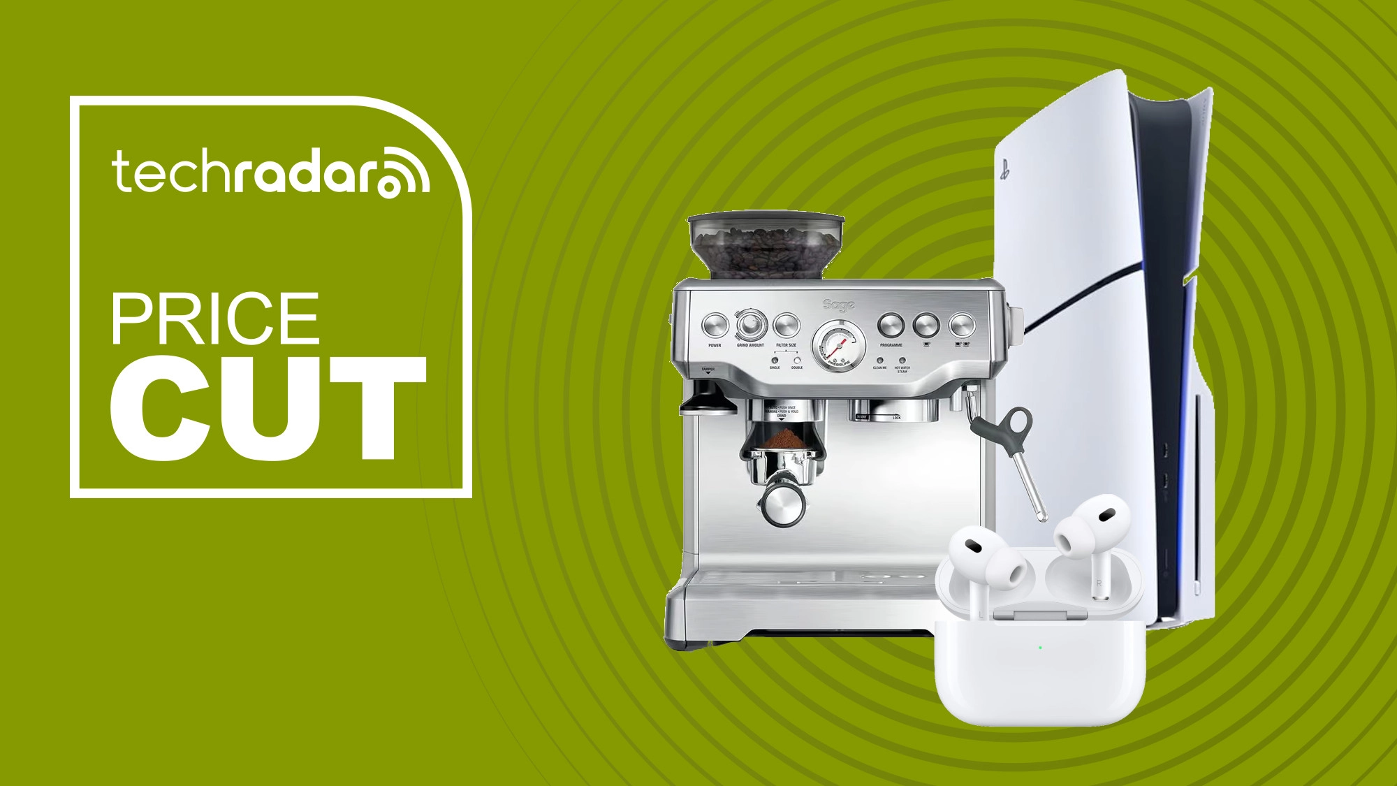 PS5, AirPods Pro 2 and Sage coffee maker on a green background