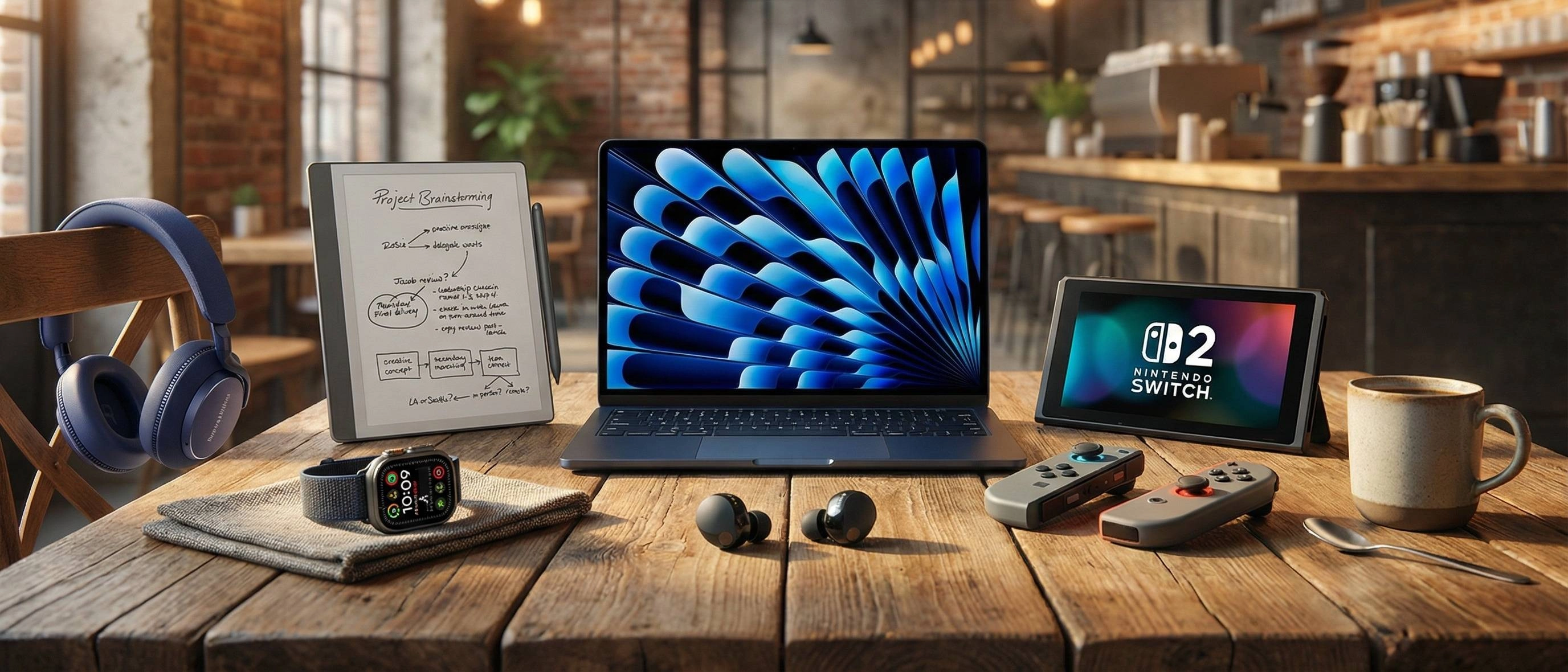 The MacBook Air M4, Apple Watch Ultra 2, Nintendo Switch 2, Kindle Scribe, Sony WF-1000XM5 and Bowers & Wilkins Px7 S3 all laid out on a rustic wooden table in a warmly lit coffee shop.
