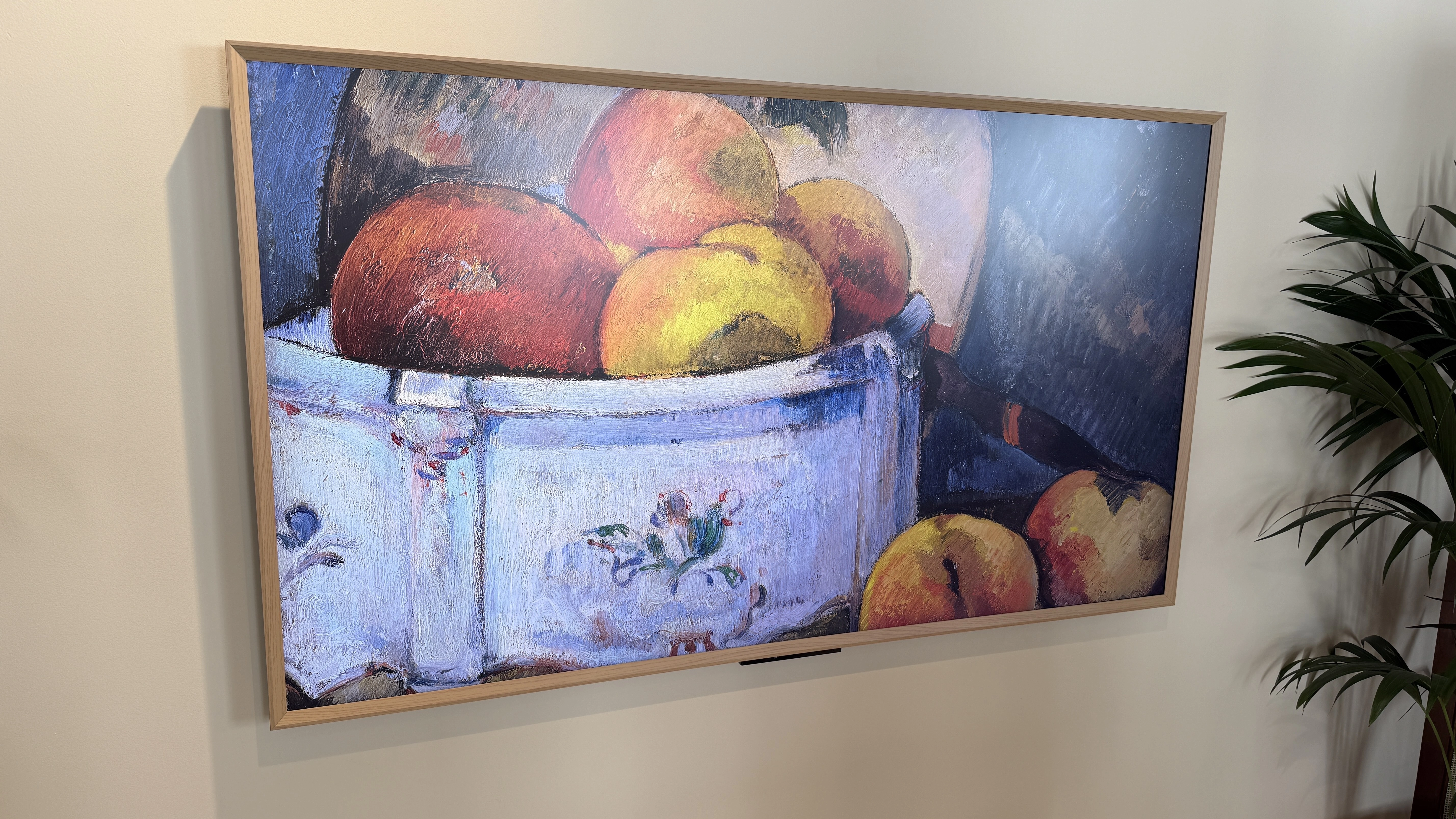 Art itself, however, looked very nice on it. We also saw the Artline with a brown-wood design frame on it (one of 10 colors) which again looked great, made even better with the included near-flush wall mount which fit snugly and neatly to the wall. There is a chunky black section under the frame which takes away from the sleekness a little, but this does house the sensor for Omnisense, where the TV will turn on and off when movement is detected in the room.