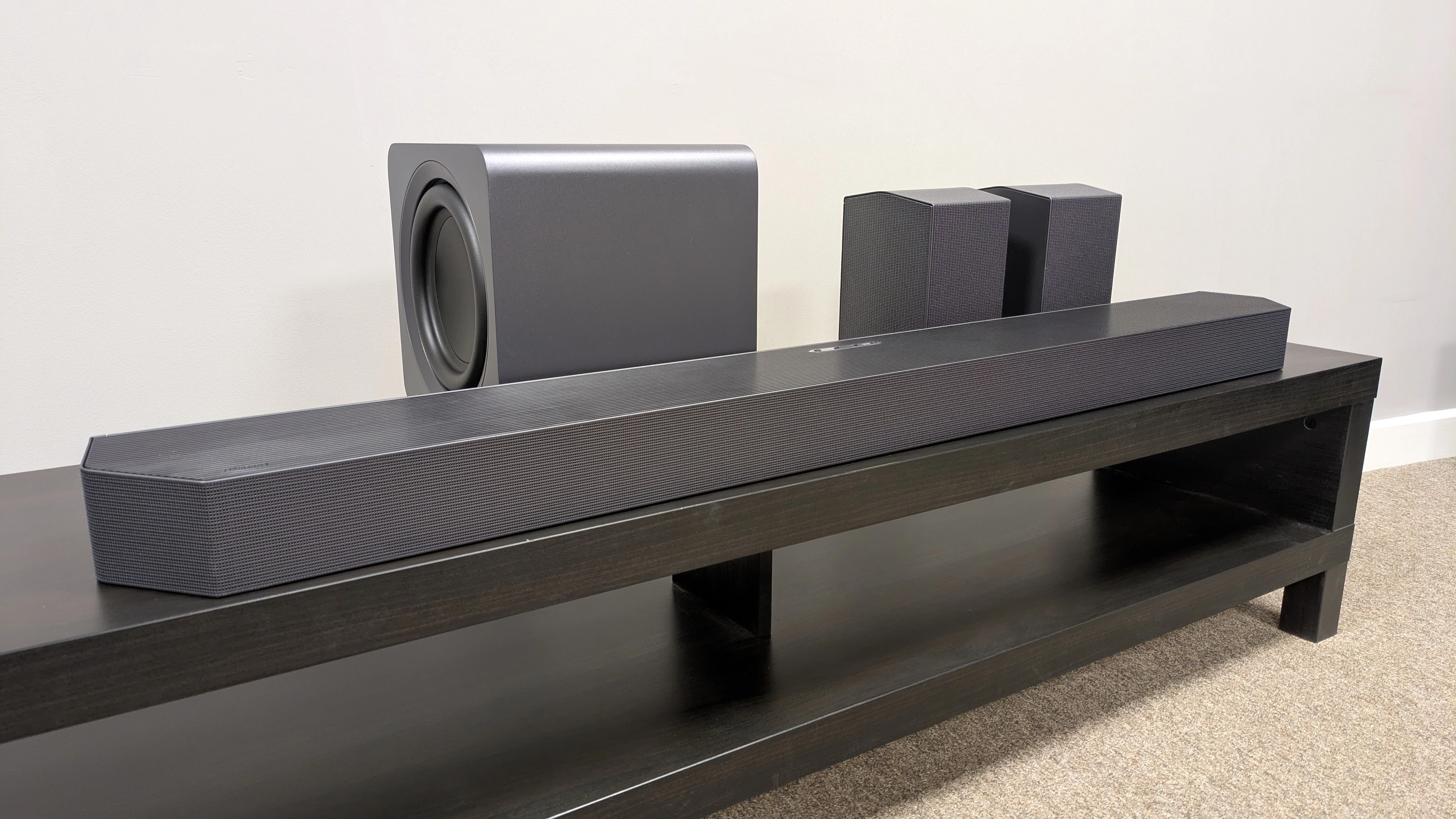 The total system is an 11.1.4-channel Dolby Atmos setup, with the front soundbar delivering seven channels across it as well as two upfiring height channels. The rear speakers each have two angled surround speakers, plus an upfiring speaker.